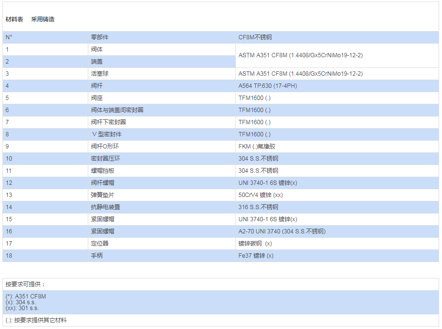 采用材料(用于閥體/活塞球/閥桿)與標(biāo)準(zhǔn)配置不同的參數(shù)要求,請(qǐng)與我們的銷售部門(mén)聯(lián)系